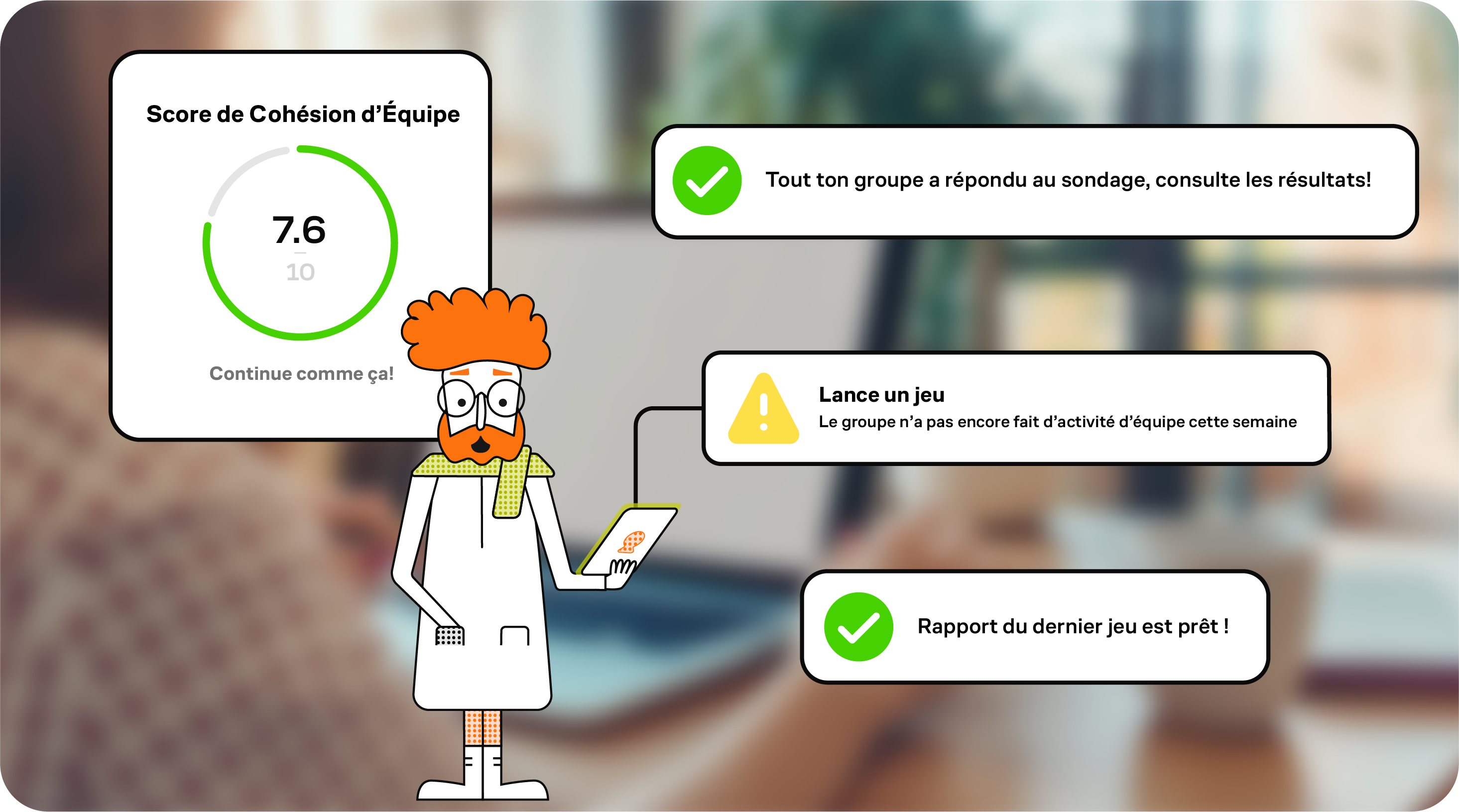 Des sondages courts (1-2 questions) pour un retour instantané, parfaitement intégrés au rythme de ton équipe.